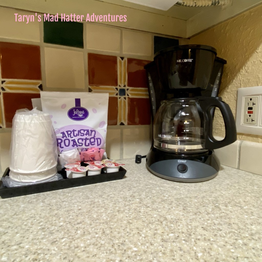 The Deluxe Villas have a small kitchenette area with a toaster, microwave, coffee maker, sink, mini fridge, and some paper utensils and plates, etc.