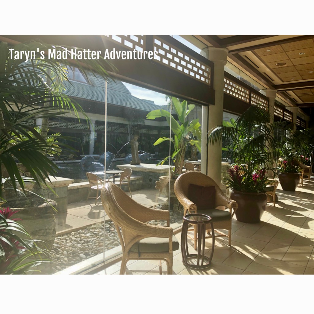 This is the little courtyard area next to the lobby. You can see the blue awning, which is where the ticket desk is, and Avis rental car is at the red awning.