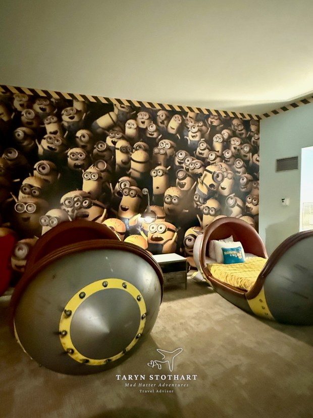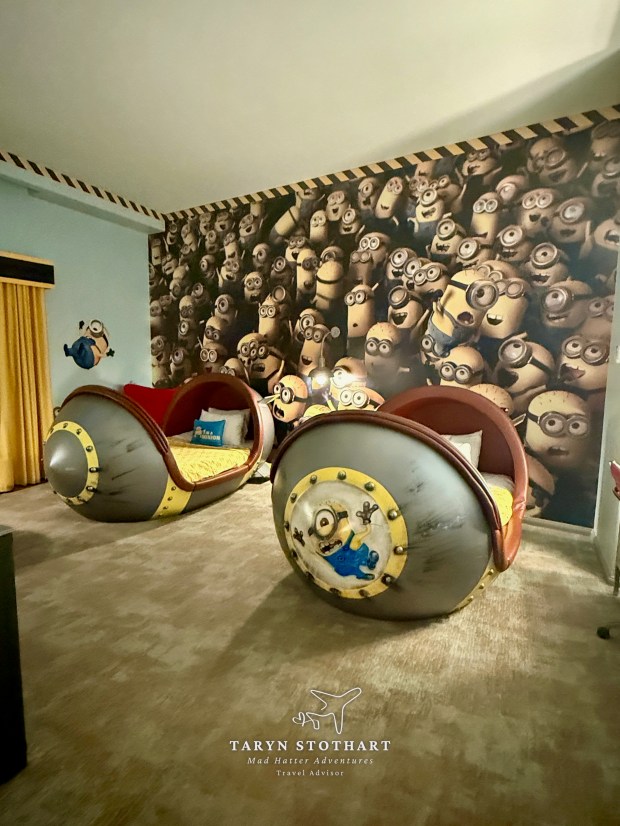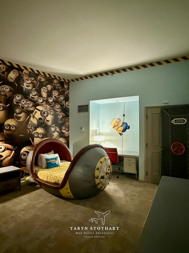 I first went to get our park tickets in the lobby. It was a very easy process. Then I went to check-in for the room and she mentioned we had received an upgrade to Minion Kids Suite. WOO HOO! I had booked the least expensive room available to us, so this was a pleasant surprise. The room was not ready, so we dropped our bags with Bell Services and proceeded to the park after taking some photos around the property.