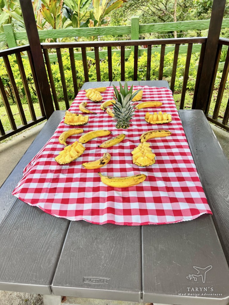 Orlando told us to meet him over at some picnic tables when we were finished taking photos and using the restroom, etc. He had this nice surprise for us…fresh cut pineapple and bananas! He literally cut them right there for us with his knife and cutting board.