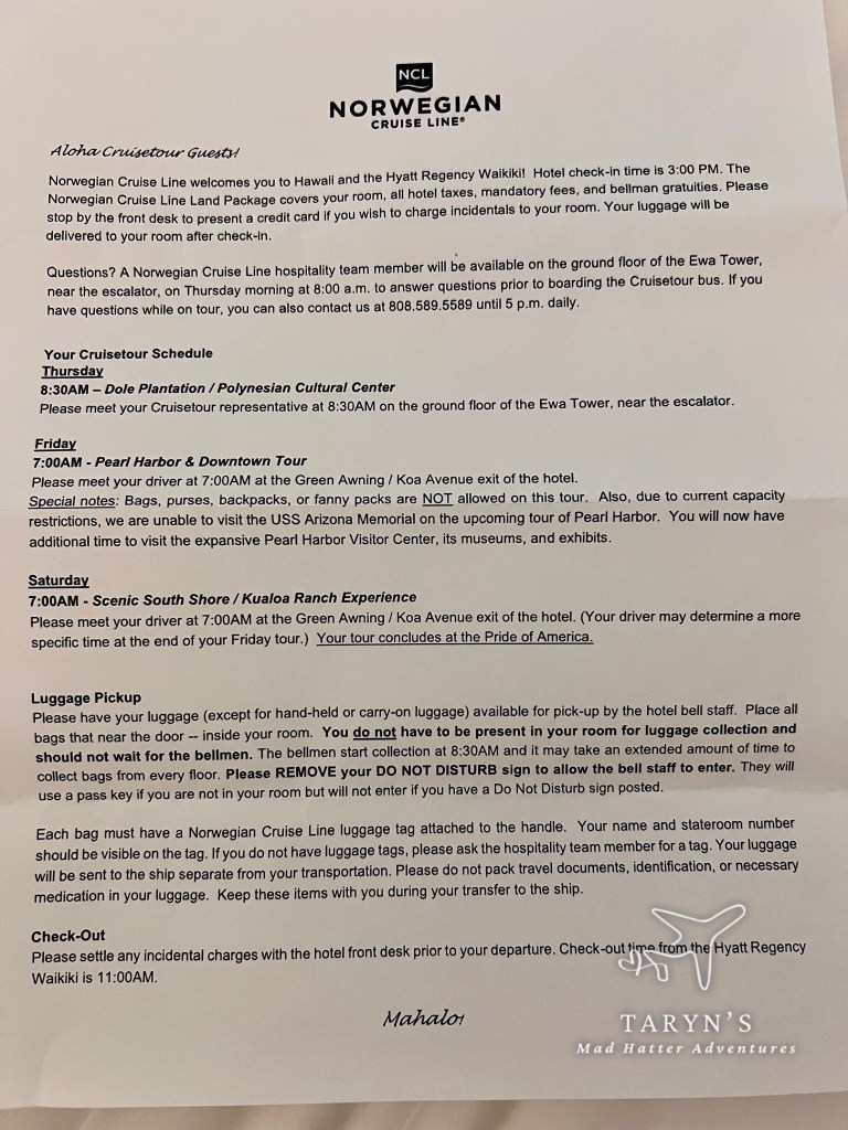 Upon landing in Honolulu, we were advised (through our NCL CruiseTour paperwork) to just head to baggage claim, get our baggage, and then look for the NCL staff member. We looked and looked, and looked, and could not find one anywhere! I even stopped anyone that had a badge on and asked. Several of them told me that they should be walking around shouting out. We saw no one! I even walked the entire length of the baggage claim. Finally after about 30-45 minutes, someone arrived. She checked us off a list and then passed us along to someone else. No one helped us with our luggage. They took us outside to sit and wait for the shuttle. We had four other people on the shuttle with us. Two were dropped at a different hotel, and the rest of us continued on to the Hyatt Regency Waikiki Beach Resort and Spa. This is the hotel NCL uses for the CruiseTour.