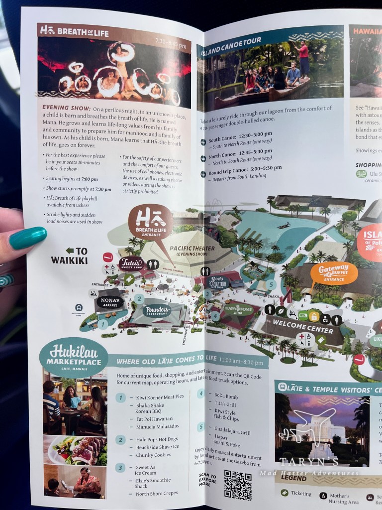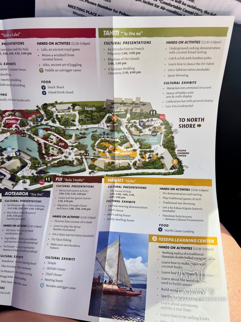 We last left off with our Dole Whip at the Dole Plantation. When we boarded the bus at the plantation, Gar had some information about the Polynesian Cultural Center on our seat. Here is the map and then smaller bits of the map closer up. This is where we were headed next.