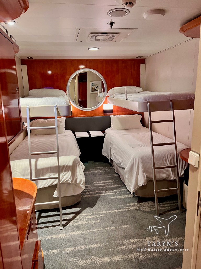 Because we were boarding later in the day, our cabin was ready and we were able to go directly there to unload our carry-ons. We were staying in an Inside Cabin. There were four of us, so two pullmans and two twin beds on the bottom. With this layout, it did not give us the option to have one queen bed on the bottom…probably because of banging heads!