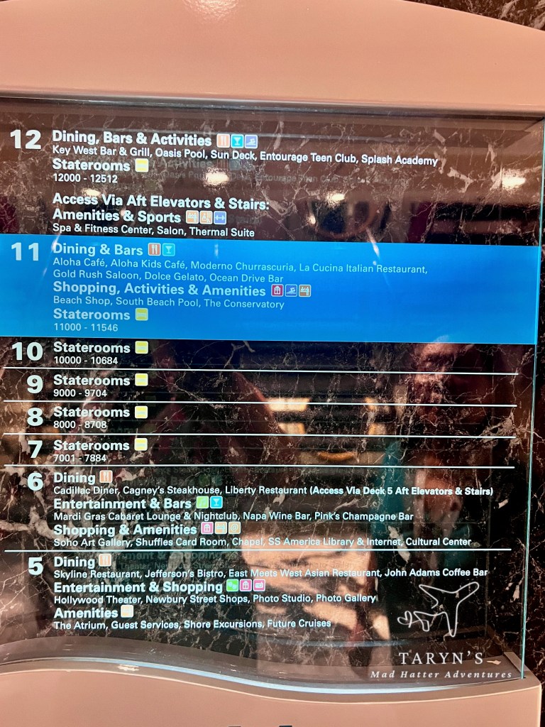 We decided to explore the ship some. We weren’t really hungry since we had a good lunch. These ship maps were near each elevator.