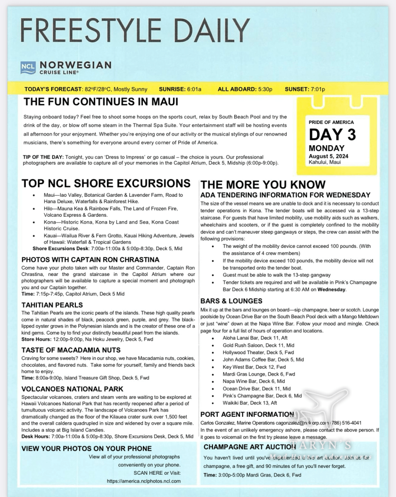 I was so excited to be going on this trip of a lifetime with my mom and two daughters. It was upon her request, as it’s something she has always wanted to do. The CruiseTour consisted of a land portion from July 31-August 3, and then a cruise from August 3-August 10. The land portion had tours to the following: Dole Plantation and Polynesian Cultural Center, Pearl Harbor and Downtown, and Scenic South Shore and Kualoa Ranch. The cruise departed from Honolulu, with stops in Maui, Hilo, Kona, and Kauai.