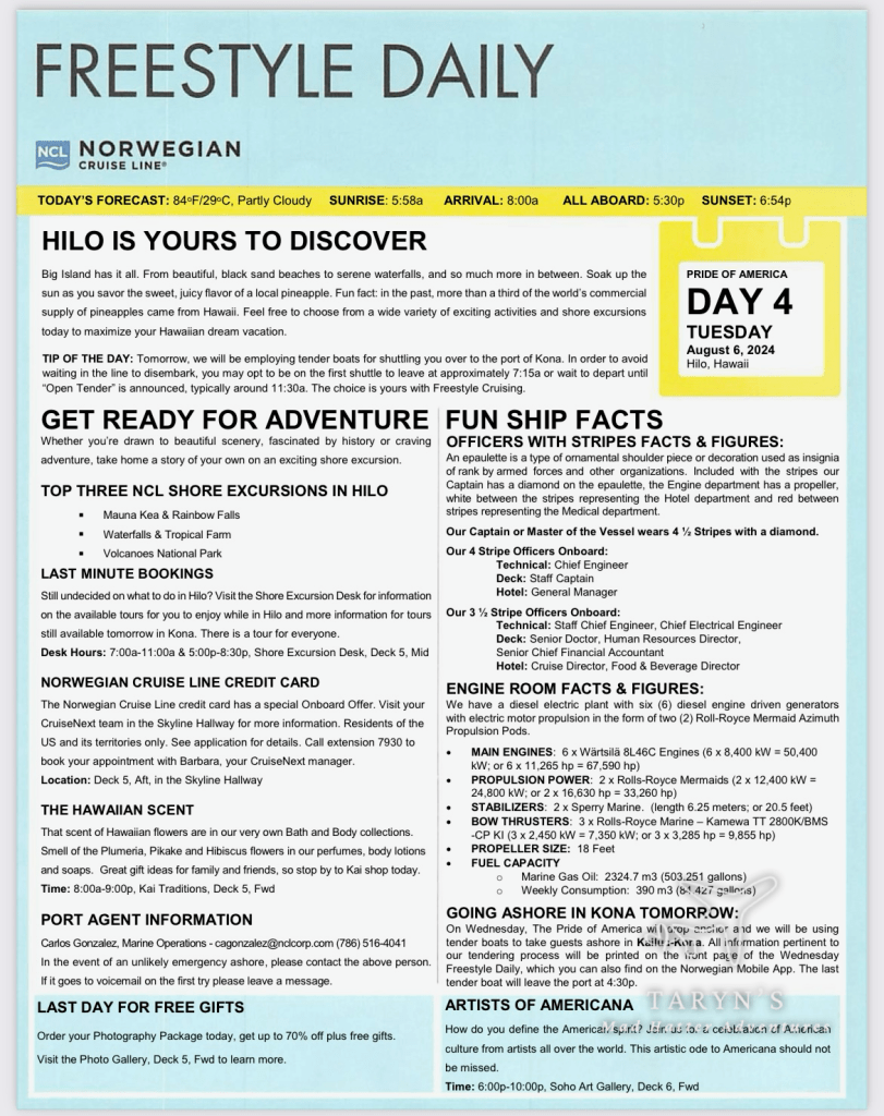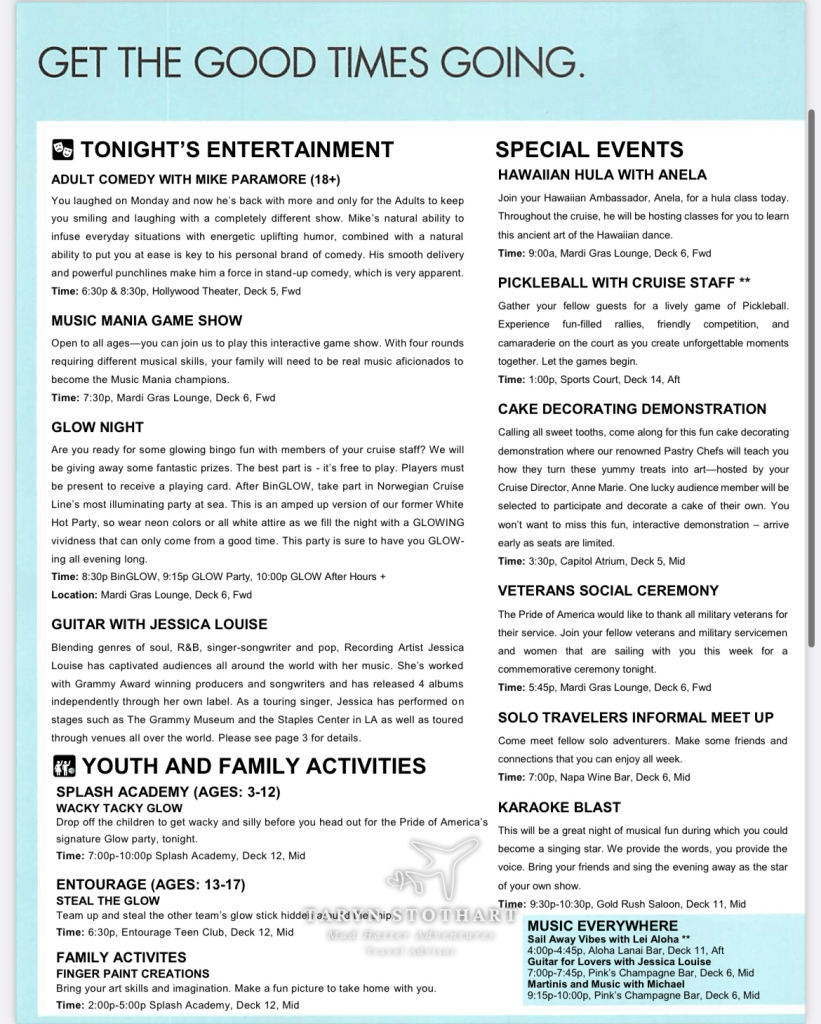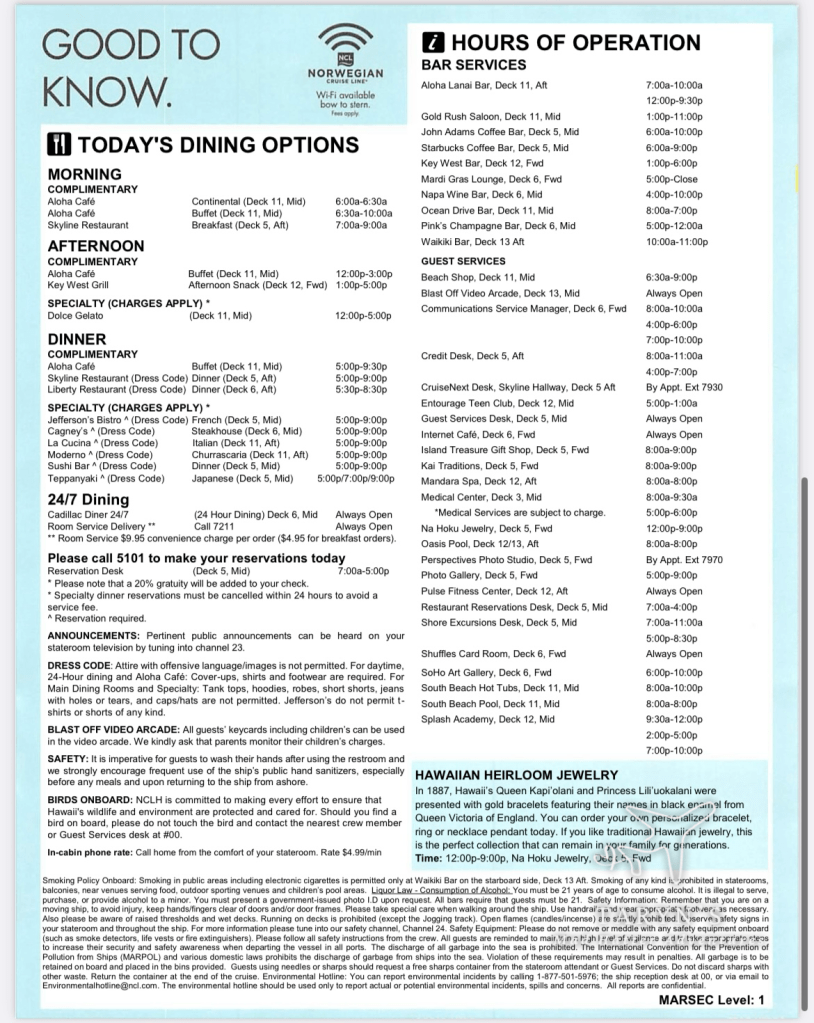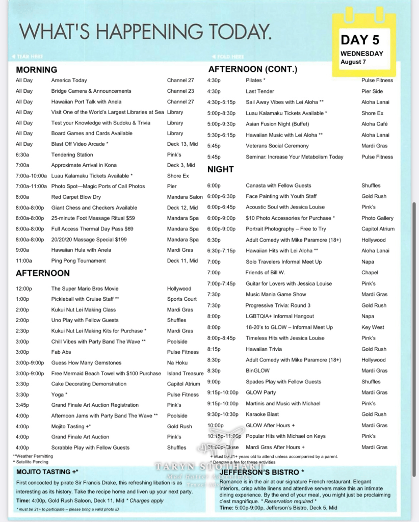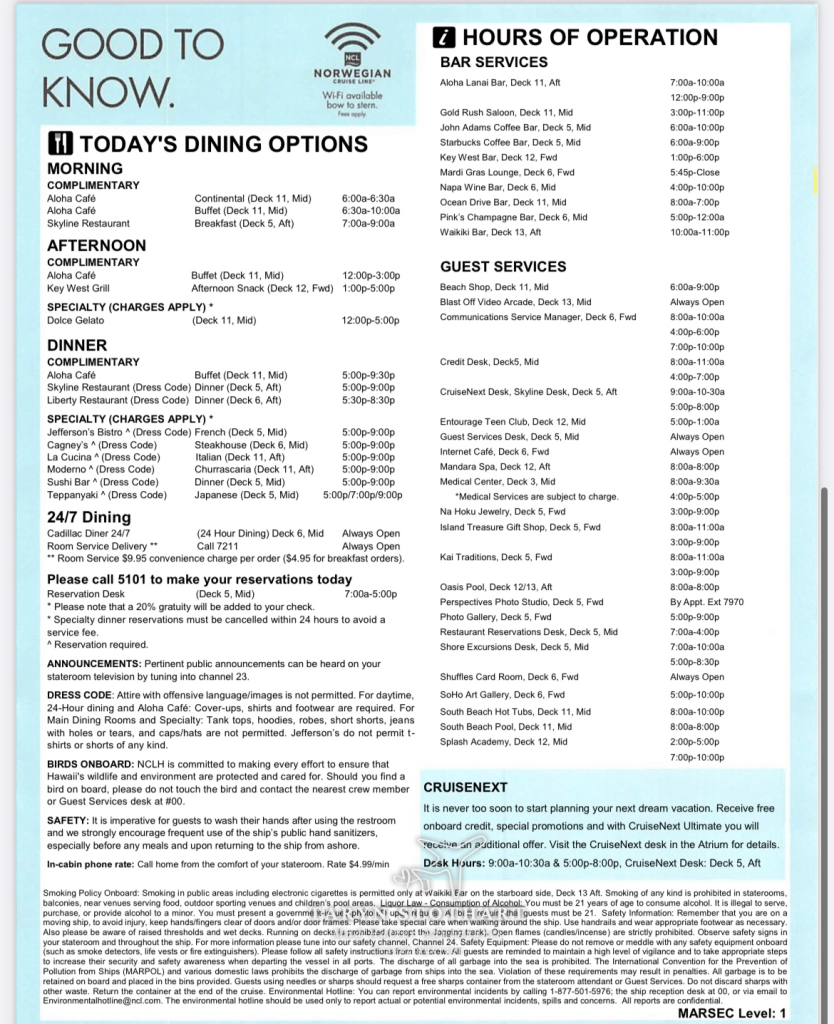 Here’s the Freestyle Daily for Day 1. This included everything for the day…dining options, entertainment, etc.