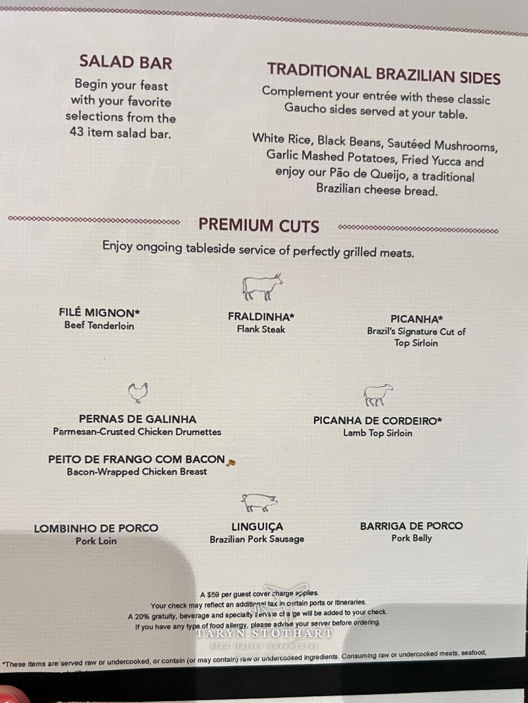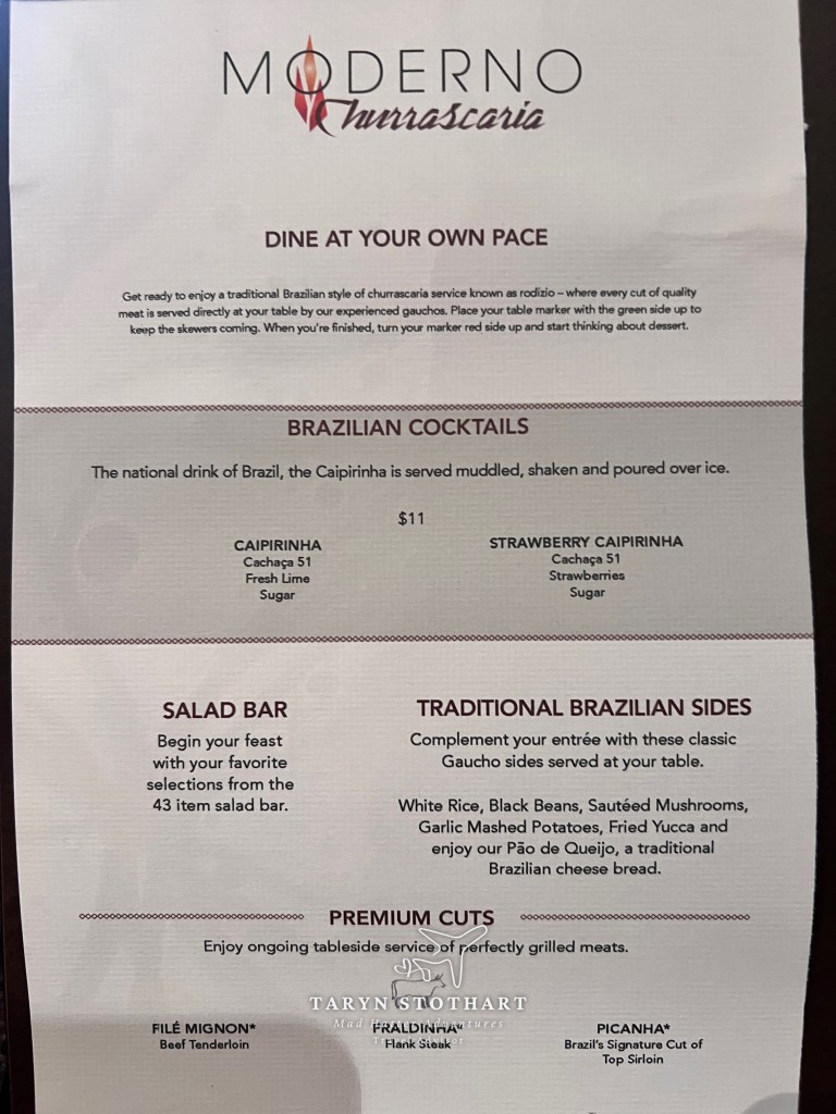 We went back to the ship in the late afternoon and just relaxed some more. For dinner, my mom and I were going to eat at Moderno, a specialty dining Brazlilian steakhouse! I did make a reservation prior to getting on the ship.