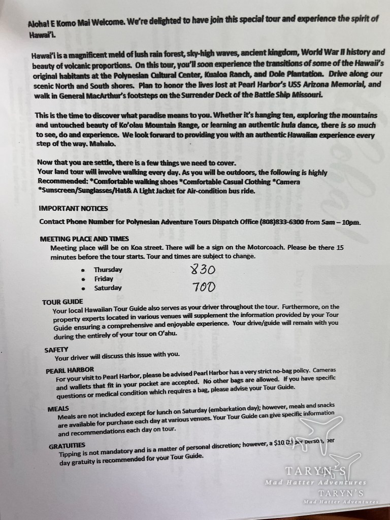 I was so excited to be going on this trip of a lifetime with my mom and two daughters. It was upon her request, as it’s something she has always wanted to do. The CruiseTour consisted of a land portion from July 31-August 3, and then a cruise from August 3-August 10. The land portion had tours to the following: Dole Plantation and Polynesian Cultural Center, Pearl Harbor and Downtown, and Scenic South Shore and Kualoa Ranch. The cruise departed from Honolulu, with stops in Maui, Hilo, Kona, and Kauai.