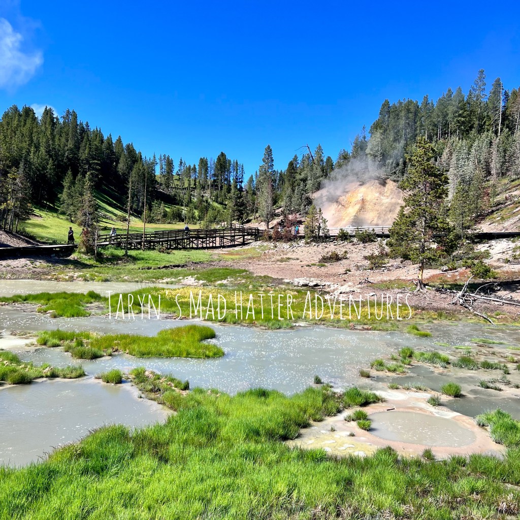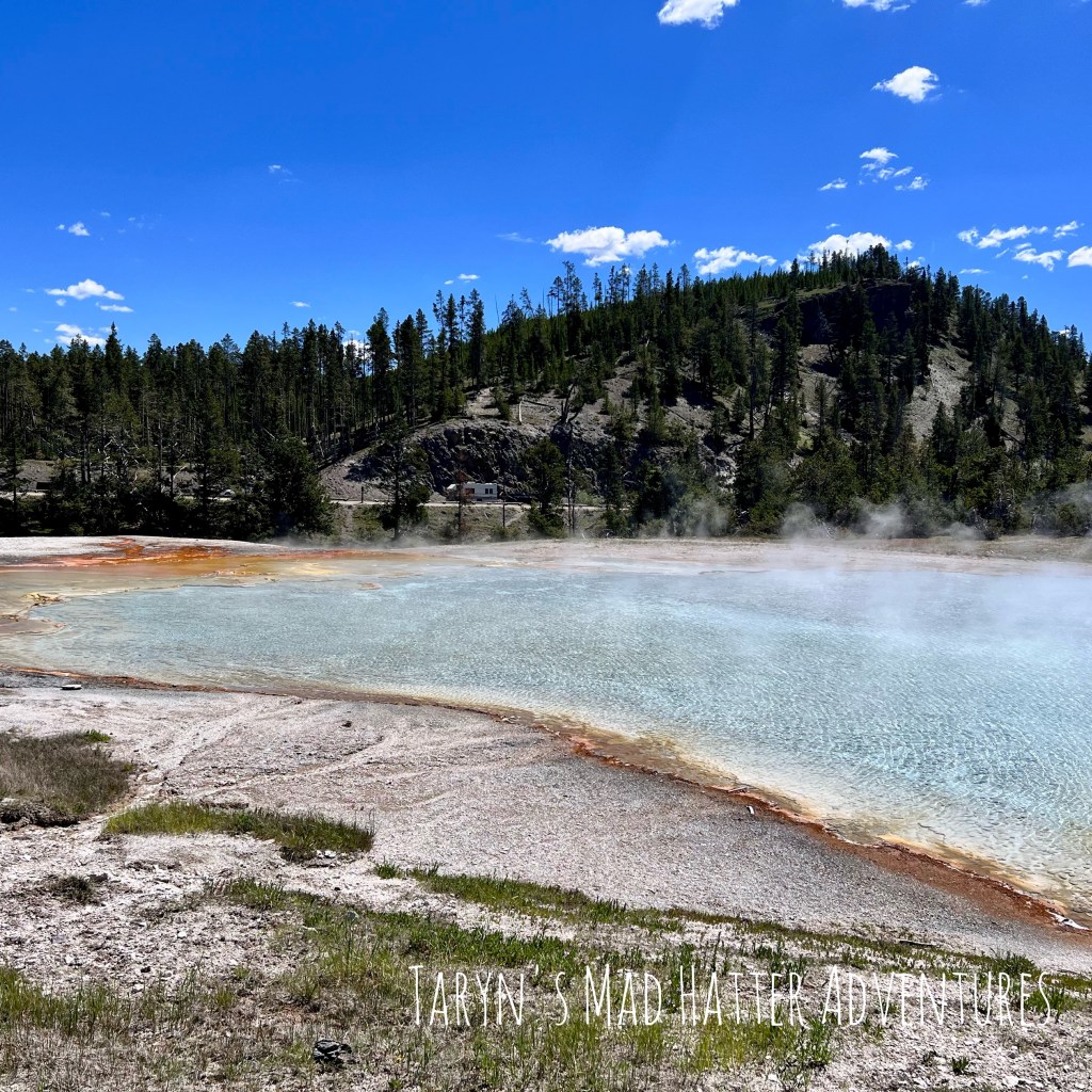 Upon entering the park, we headed south towards the Midway Geyser Basin, which is where the Grand Prismatic Spring is located. When researching the trip, I knew this was one destination I definitely wanted to visit! This area was veryyyyy busy. The small parking lot was completely full and we waited in a long line of cars to park one by one as people left their spots. In hindsight, we left the hotel around 10 a.m. and finally were able to park around 11:30 a.m. If you are interested in this area, I would get there in the early morning!