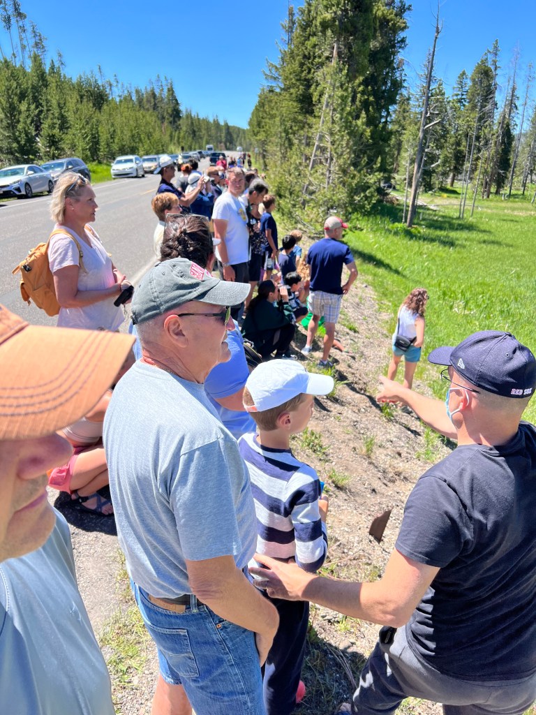 We had an exciting moment on the way to Old Faithful. There were tons of cars pulled over, and park rangers were out with cones directly traffic along. This could only mean one thing….